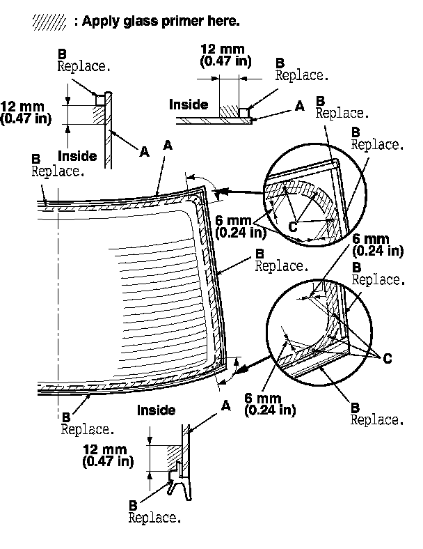 - Apply the glass primer to the corner areas of the rear window using the printed dots (C) on the rear window as a guide.