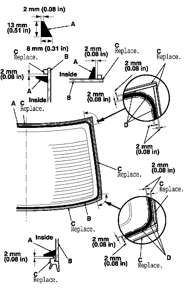 20. Put the cartridge in a caulking gun, and run a continuous bead of the adhesive (A) to the rear window (B) along the edge of the rubber dams (C) as shown: