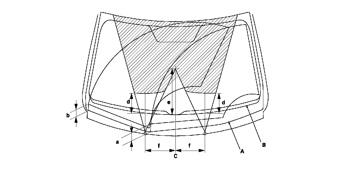 e: Position at about 15 in (380 mm) from the top of the black ceramic area (B) at the lower windshield.