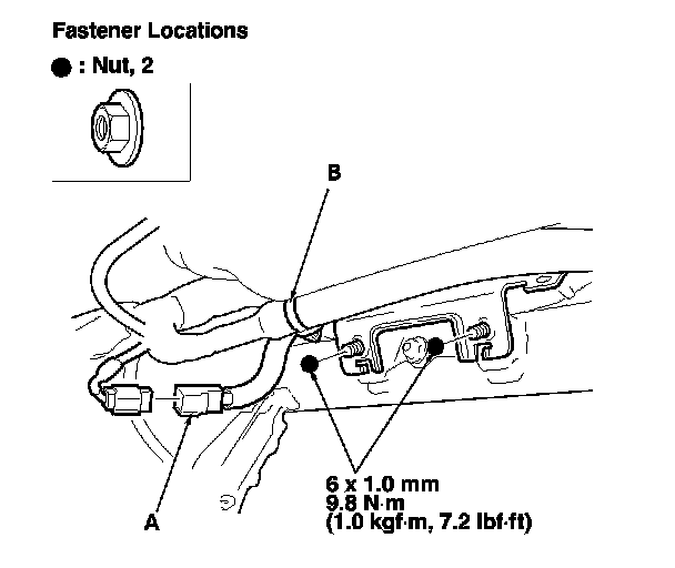 4. Disconnect and detach the passenger's airbag connector (A), from the steering hanger beam, and detach the steering hanger beam wire harness clip (B). Remove the passenger's airbag mounting nuts.