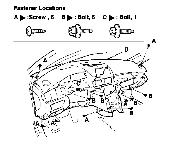 6. From the front of the dashboard, remove the screws (A) and the bolts (B, C) securing the dashboard/steering hanger beam (D).
