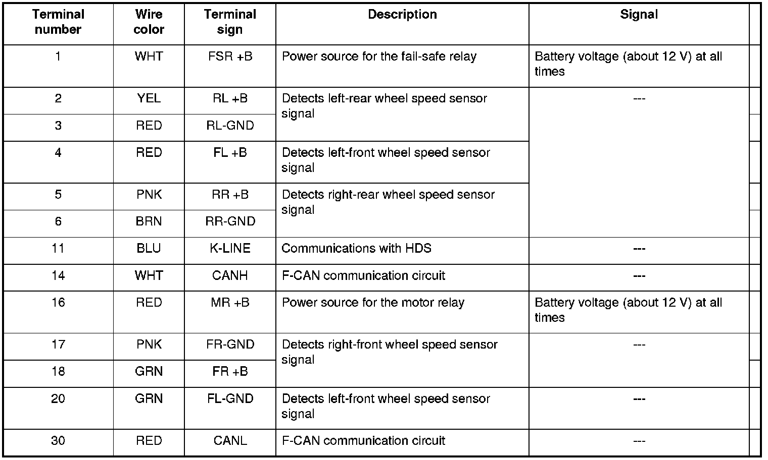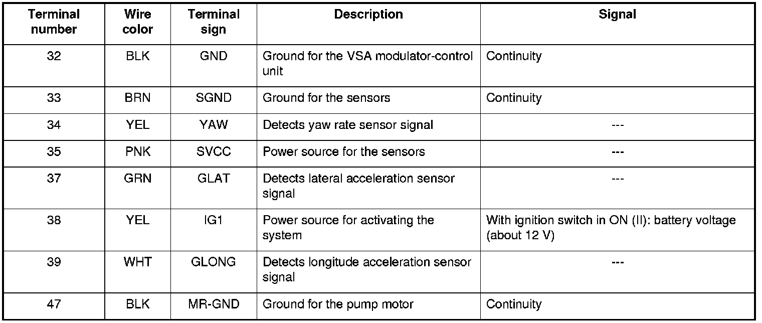 VSA Modulator-Control Unit Inputs and Outputs for 47P Connector (Connector Disconnected)