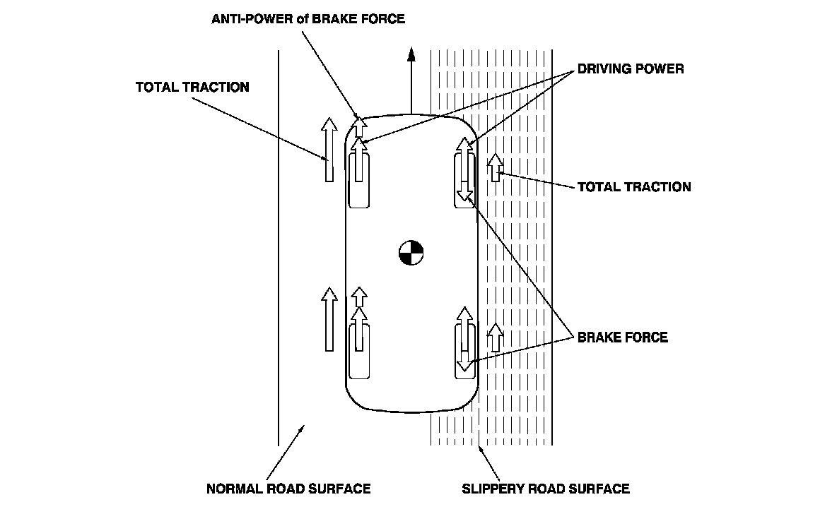 The TCS provides low-speed traction. When a drive wheel loses traction on a slippery road surface and starts to spin, the VSA modulator-control unit applies brake pressure to slow the spinning wheel. At that time, the VSA modulator-control unit sends a traction control signal to the PCM to reduce engine power.