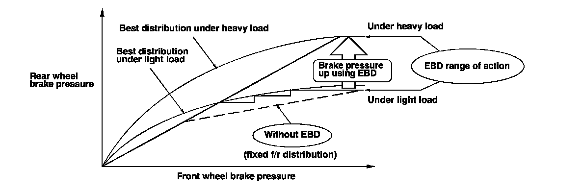 When the vehicle is heavily loaded, most of the increase in weight is born by the rear wheels, increasing braking capability. Proportioning valves maintain a fixed distribution of brake pressure between the front and the rear wheels, making it very difficult to fully utilize increased rear wheel braking capability. EBD varies brake pressure distribution according to load, using input from the wheel speed sensors, which improves overall braking performance.