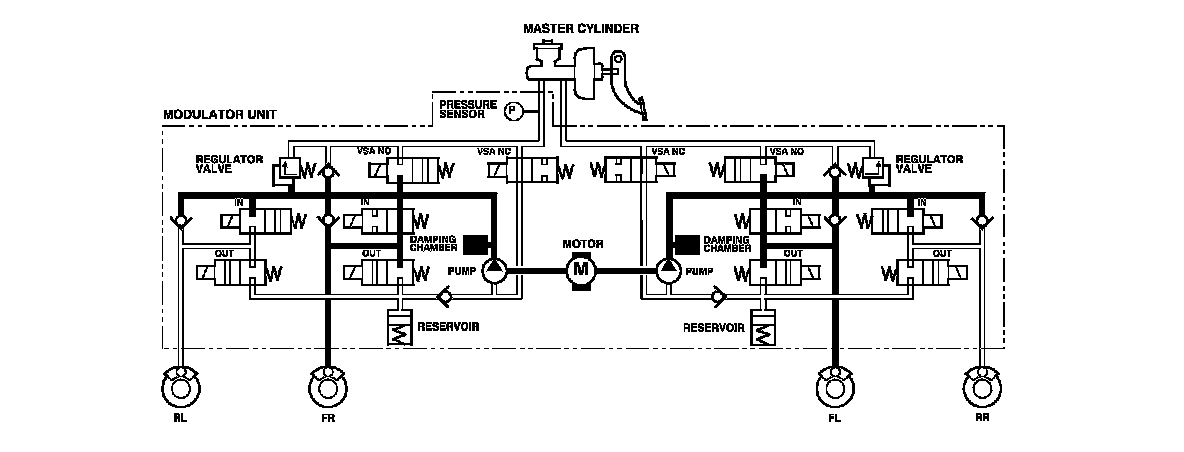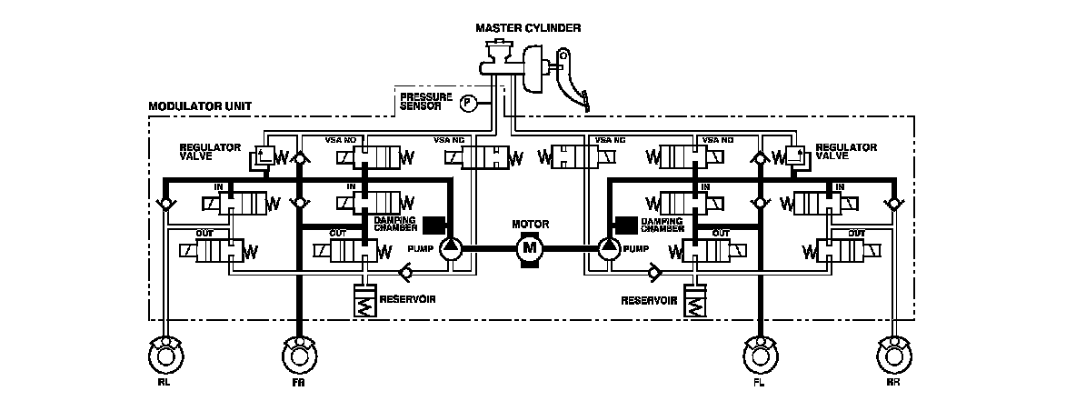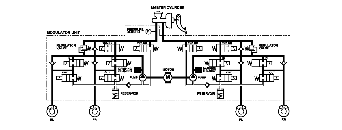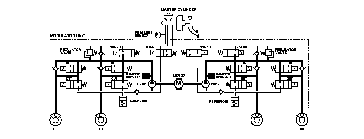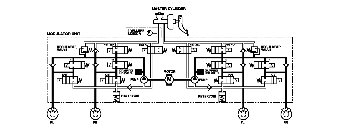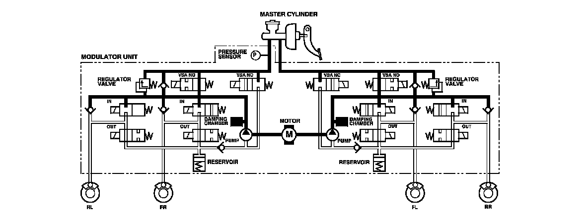 The modulator unit consists of the inlet solenoid valve, the outlet solenoid valve, the VSA normally open (NO) solenoid valve, the VSA normally closed (NC) solenoid valve, the reservoir, the pump, the pump motor, and the damping chamber.