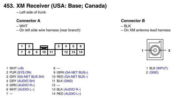 View 453 - XM Receiver Connector View (USA: Base; Canada)