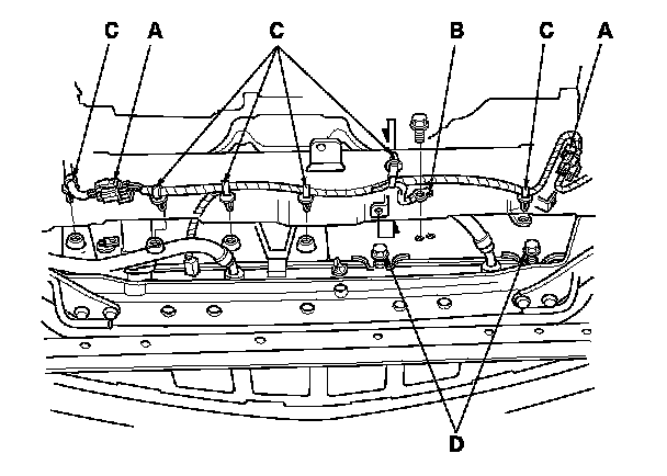 9. Install the harness connectors (B), the ground cable (C), and the harness clamps (D).