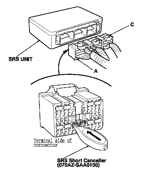 When SRS unit connectors A (28P) or C (28P) are disconnected, a short circuit is automatically created in the connector to prevent accidental deployment of the airbag. The circuit may need to be opened when diagnosis is done on the circuit. Insert a short canceller (No. 070AZ-SAA0100) in the specified cavities when necessary to keep the circuit open for diagnosis.