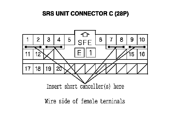 - To prevent damage to the connector cavity, insert the SRS short canceller straight into the cavity from the terminal side.