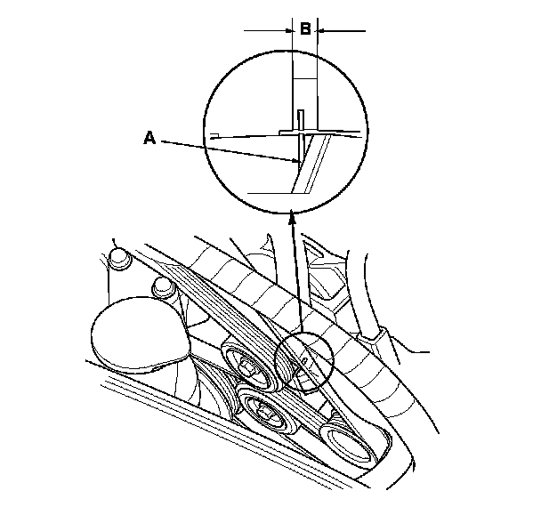 3. Check that the auto-tensioner indicator (A) is within the standard range (B) as shown. If it is out of the standard range, replace the drive belt. Service and Repair
