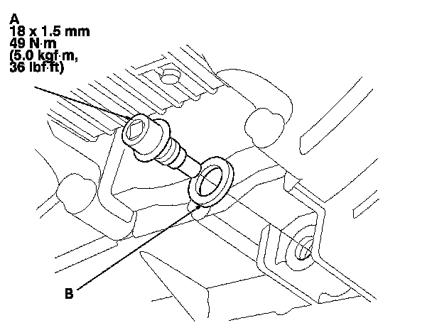 7. Install the ATF filler bolt (B) and a new sealing washer (C).
