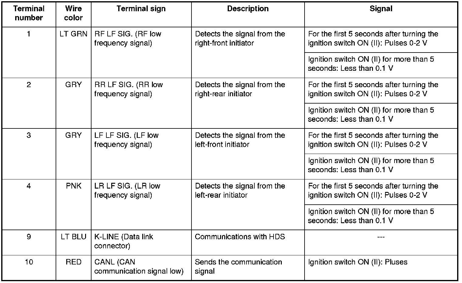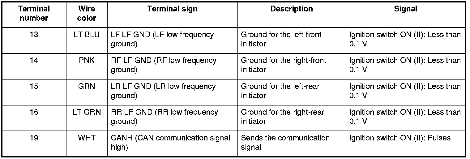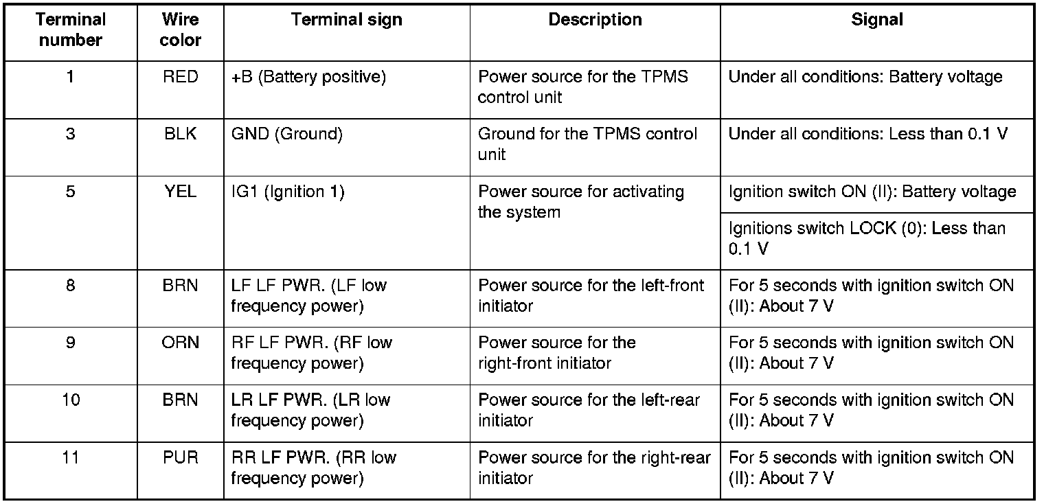 - When the ignition switch is turned to ON (II), the initiators send a LF (low frequency) band wave signal to the tire pressure sensors, switching them from sleep mode to normal function mode. When the ignition switch is turned to LOCK (0), the sensors switch from normal function mode back to sleep mode to extend their battery life.