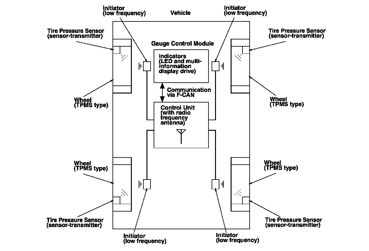 - When the vehicle is running, a RF (radio frequency) band wave signal is transmitted from each tire pressure sensor to the control unit.