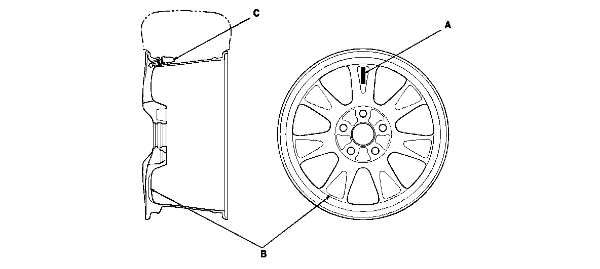 The TPMS will not work unless TPMS type wheels are installed on the vehicle. The original equipment wheels have a "TPMS" mark (A) on them, and a counterweighted (B) by adding material on the opposite side of the tire pressure sensor (C), to counterbalance the weight of the sensor.