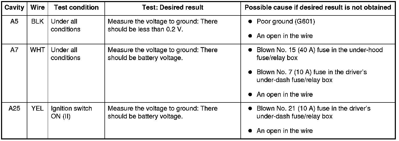 6. Disconnect driver's MPCS connector A (40P), and do these input tests at the following connector.