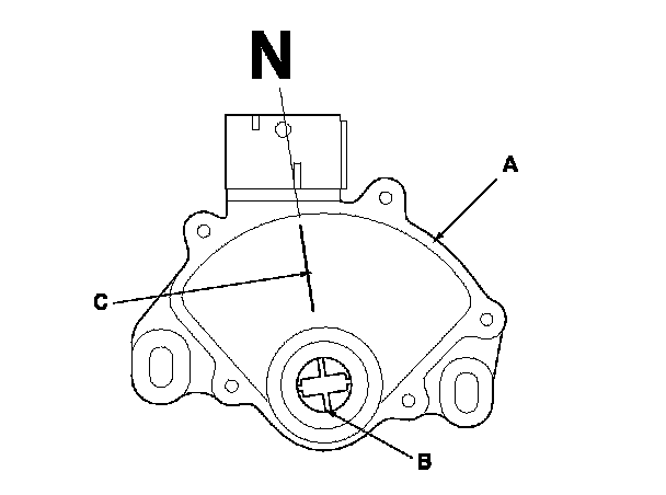 11. Set the new transmission range switch (A) to the N position. The transmission range switch clicks in the N position, and the control shaft hole (B) aligns with the N position line (C).