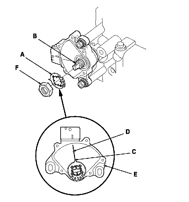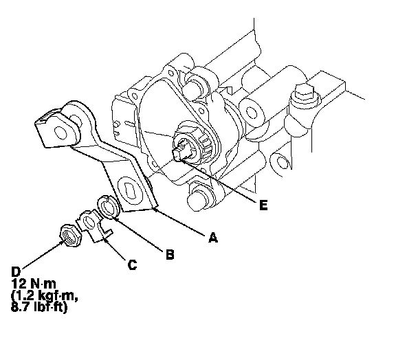 14. Install the new lock washer (A) over the control shaft (B) while aligning the indicator tab (C) of the lock washer with the N positioning line (D) on the transmission range switch (E), and install the locknut (F).