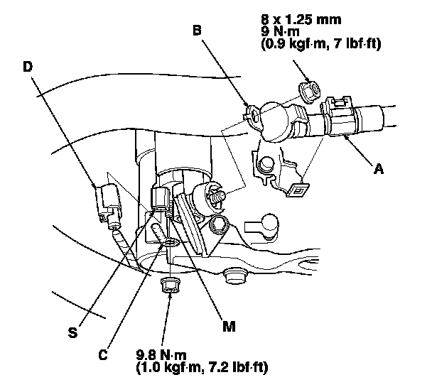 2. Remove the harness clamp (A), starter cable (B), and the motor cable (C), and disconnect BLK/WHT wire connector (D).
