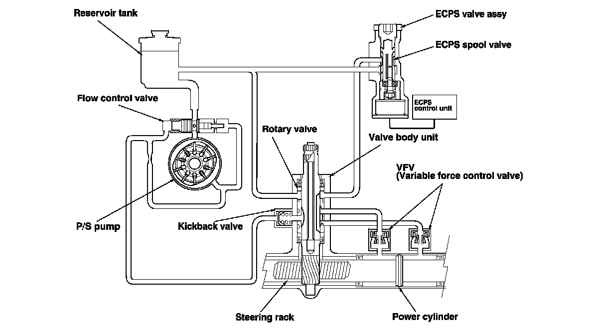 This vehicle is equipped with an Electronically Controlled Power Steering System (ECPS). Depending on the vehicle speed, the ECPS control unit controls the ECPS valve. The ECPS valve changes the P/S fluid pressure of the pressure side of the power cylinder. By controlling the P/S fluid pressure electrically, it made it possible to supply stable P/S fluid pressure to the power cylinder which ensures that the steering feel is not influenced by the fluctuation of the engine's speed, and corresponds to the driving situation.