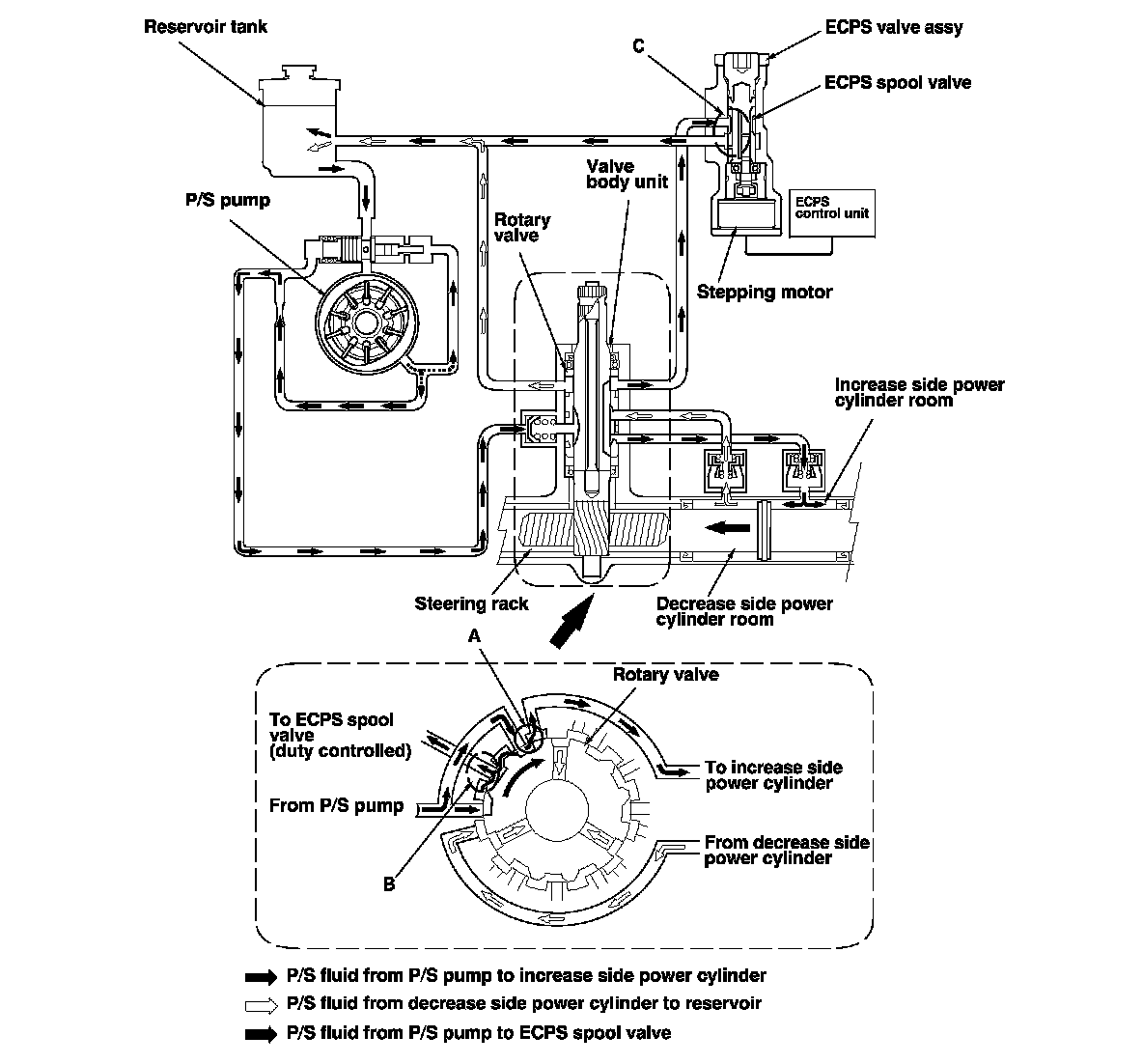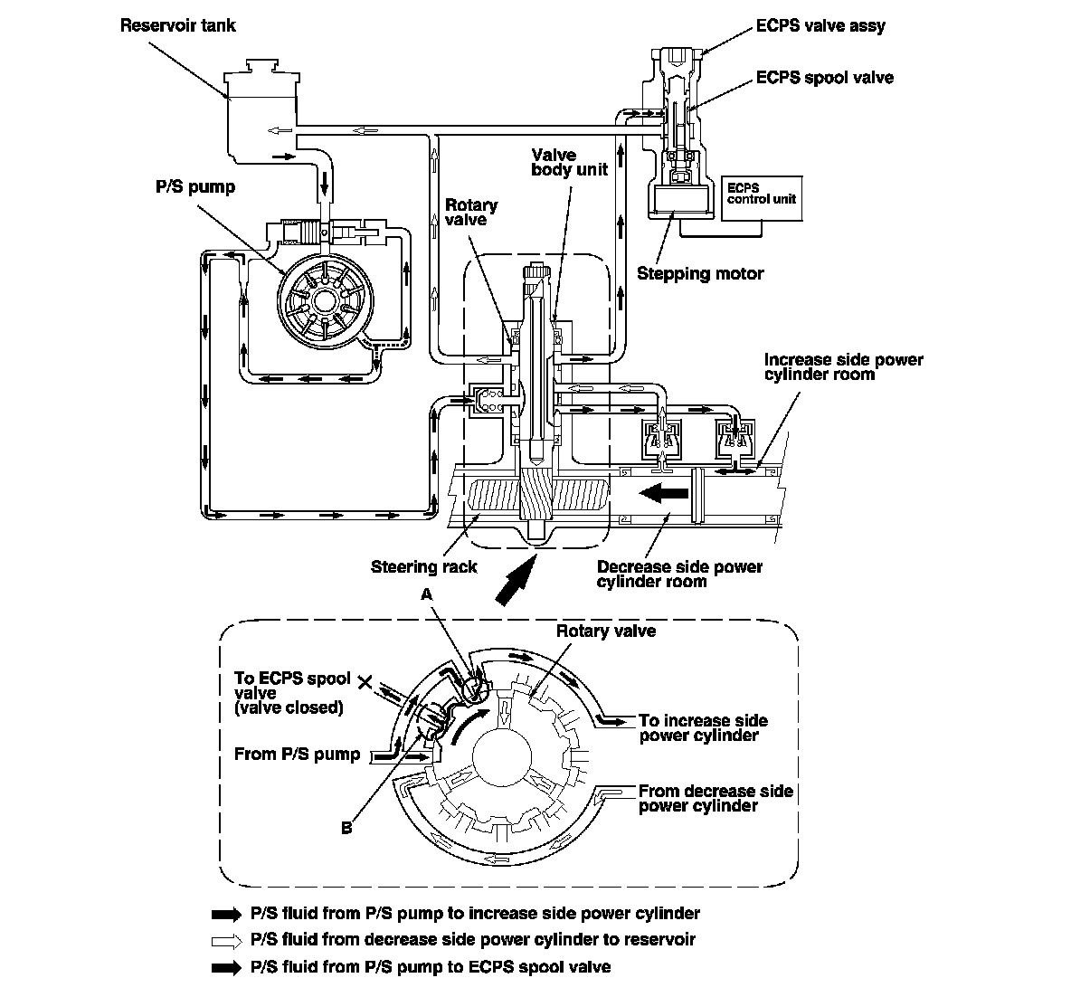 When the vehicle is stopped, the ECPS control unit closes the ECPS spool valve. When the steering wheel is turned, the passage between the increase side power cylinder room and the pump opens at the rotary valve. Because the spool valve is closed, all P/S fluid pressure is guided to the increase side power cylinder room passing the variable aperture of vehicle moving (A) at the rotary valve. At the same time, the passage between the decrease pressure side of the power cylinder room and the reservoir opens at the rotary valve, and the P/S fluid inside the decrease side of the power cylinder room returns to the reservoir. By this operation, the power steering system assists with strong force depending on the variable aperture of stationary steering (B) clearance.