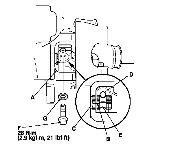 2. Align the bolt hole (D) on the steering joint with the groove (E) around the steering column shaft, and loosely install the joint bolt (F) and washer (G). Be sure that the joint bolt is securely in the groove in the steering column shaft.