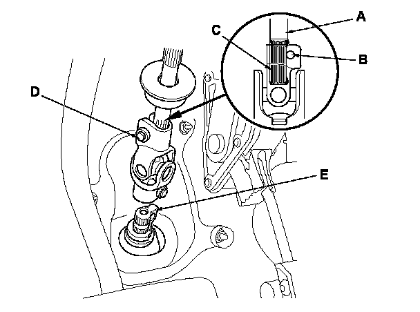 4. Insert the upper end of the steering joint into the steering shaft (A) (line up the bolt hole (B) with the flat portion (C) on the shaft), and loosely install the upper joint bolt (D).