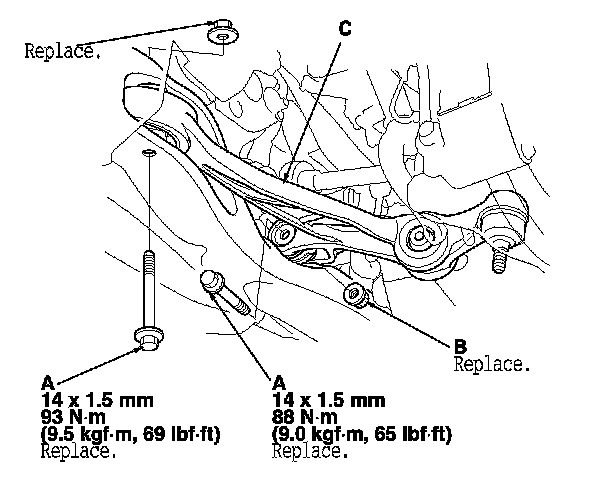 7. Remove the flange bolts (A) and the self-locking nut (B), then remove the lower arm (C).