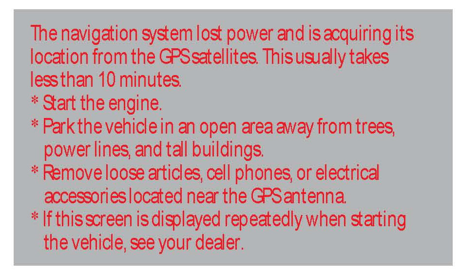 6. If the system does not initialize within 10 minutes, a second screen, shown below, appears. The system is still initializing but will not automatically exit to the globe screen when the initialization is complete. Do not immediately follow the instructions on the screen. After 30 minutes, try restarting the vehicle to see if the navigation system completed the initialization. If not, follow the instructions on the screen.
