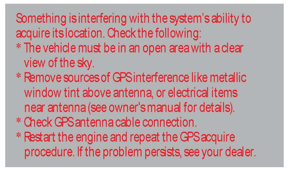 ^ The GPS antenna receives location information from orbiting satellites. Anything that blocks or interferes with the signal affects accuracy. The GPS signal can be blocked or interfered with (vehicle position shown incorrectly on the map) by: