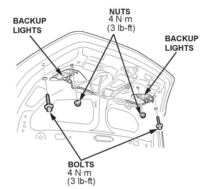 7. Remove the two bolts and the two nuts from both back-up lights. Do not remove the lights.