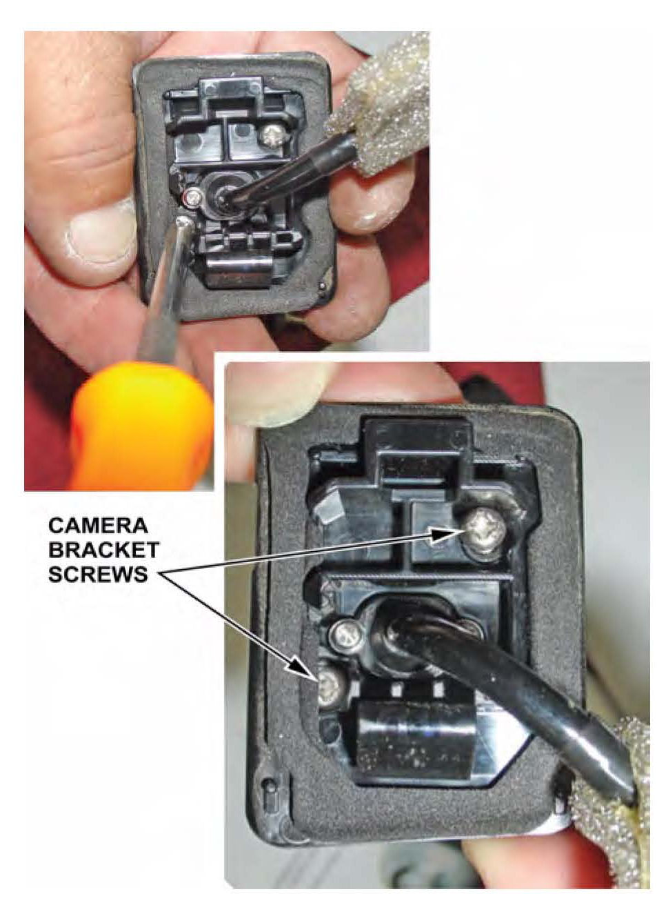 13. Slide the camera harness through the hole in the new bracket, then secure the camera to the bracket with two new screws.
