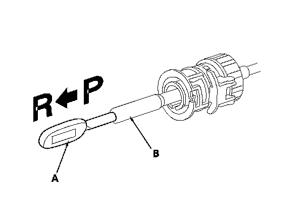 7. Push the shift cable (A) until it stops, then release it. Pull the shift cable back one step so that the shift position is in R. Do not hold the shift cable guide (B) to adjust the shift cable.