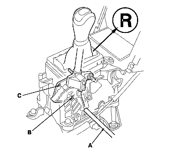 10. Place the shift lever in the R position, then insert a 6.0 mm (0.24 in) pin (A) through the positioning hole (B) on the shift lever bracket, through the positioning hole (C) on the shift lever, and into the positioning hole on the shift lever bracket.