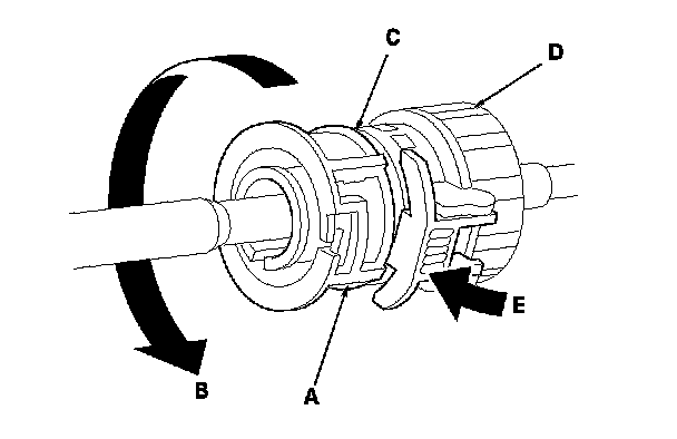 13. Rotate the socket holder retainer (A) counterclockwise (B) until it stops to create clearance (C) between the socket holder (D) and holder retainer, and push the retainer lock (E) into the socket holder retainer to lock the retainer.
