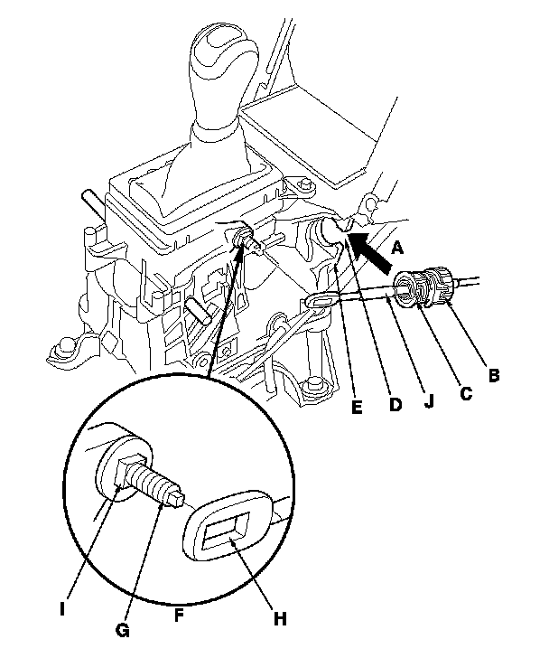 14. Align the clearance (A) between the socket holder (B) and the socket holder retainer (C) with the opening (D) in the shift lever bracket (E), then slide the holder into the bracket with installing the shift cable end (F) over the mounting stud (G) by aligning its square hole (H) with the square fitting (I) at the bottom of the stud. Do not install the shift cable by holding the shift cable guide (J).