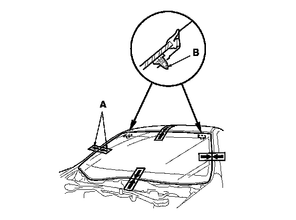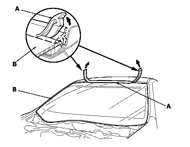 2. Remove the molding (A) from the upper edge of the windshield (B). If necessary, cut the molding with a utility knife.