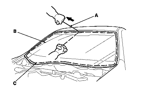 6. With a helper on the outside, pull the piano wire (A) back and forth in a sawing motion. Hold the piano wire as close to the windshield (B) as possible to prevent damage to the body and the dashboard. Carefully cut through the rubber dam and adhesive (C) around the entire windshield.