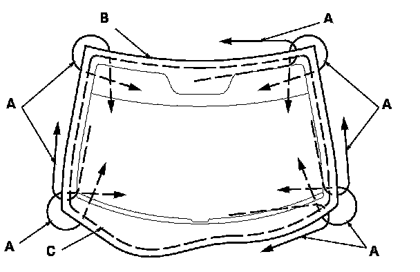 16. With a applicator, apply a light coat of glass primer around the edge of the windshield (A) between the dams (B) and the molding (C) as shown, then lightly wipe it off with gauze or cheesecloth: