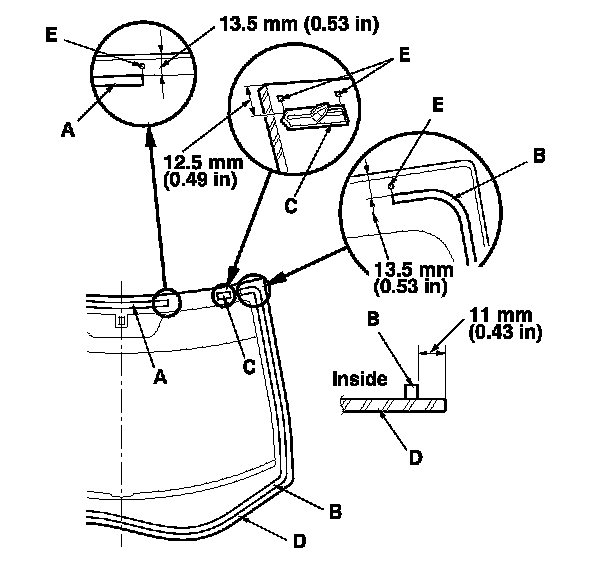 11. Attach the upper rubber dam (A), the lower rubber dam (B) with adhesive tape, and the clips (C) with adhesive tape to the inside face of the windshield (D) as shown: