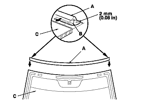 12. Attach the molding (A) with adhesive tape (B) to the upper edge of the windshield (C). Be careful not to touch the windshield where adhesive will be applied.