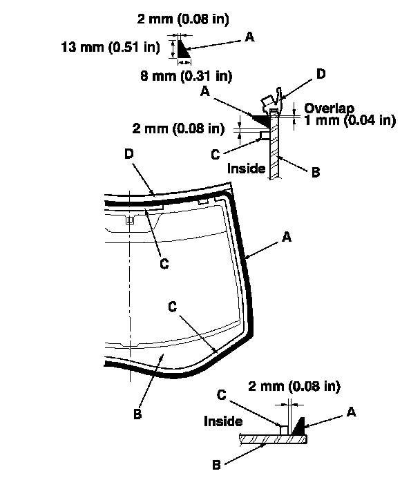19. Put the cartridge in a caulking gun, and run a bead of adhesive (A) around the edge of the windshield (B) between the dams (C) and the molding (D) as shown. Apply the adhesive within 30 minutes after applying the glass primer. Make a slightly thicker bead at each corner.