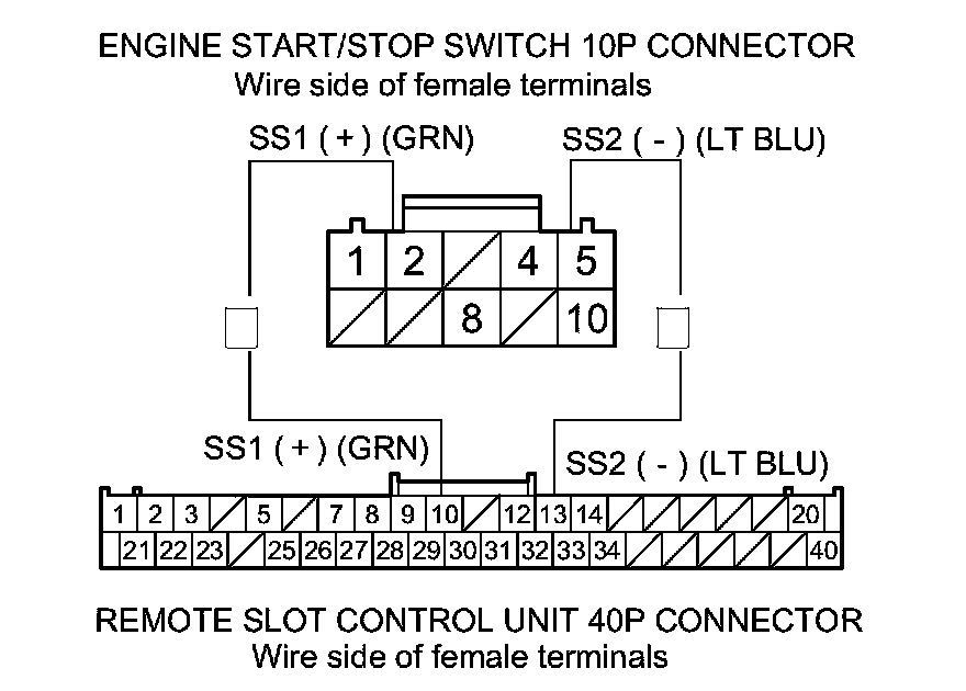 21. Check for continuity between engine start/stop switch 10P connector terminals No. 2 and No. 5, and remote slot control unit connector 40P terminals No. 10 and No. 13 respectively.