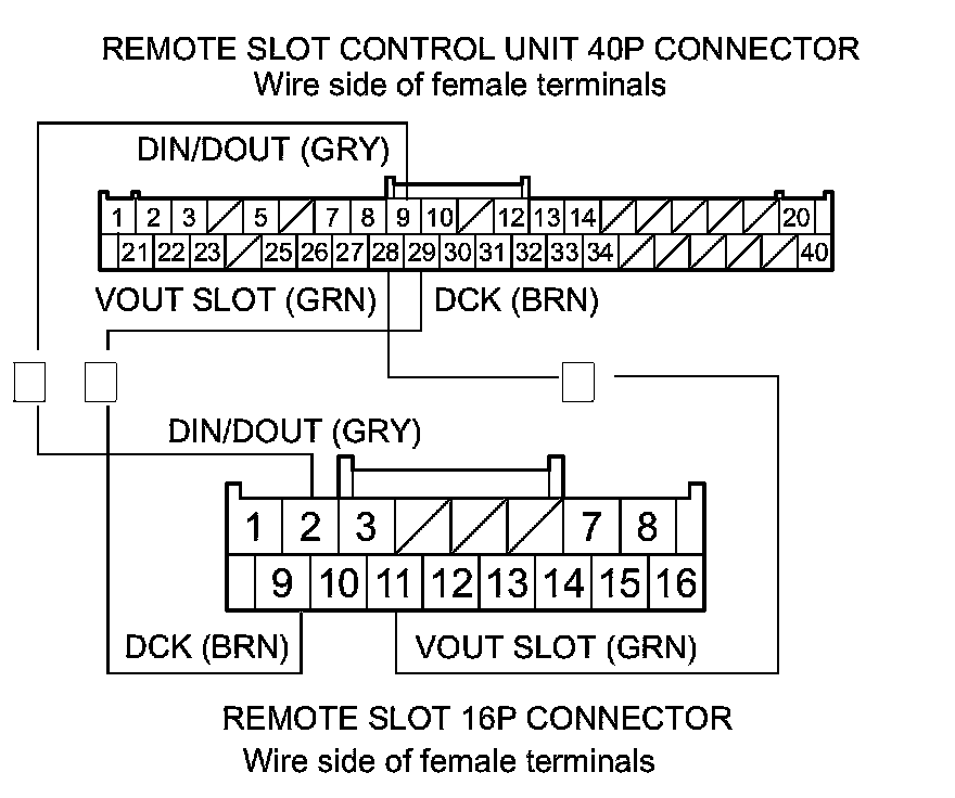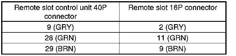 25. Check for continuity between remote slot control unit 40P connector terminals and remote slot 16P connector terminals as shown.