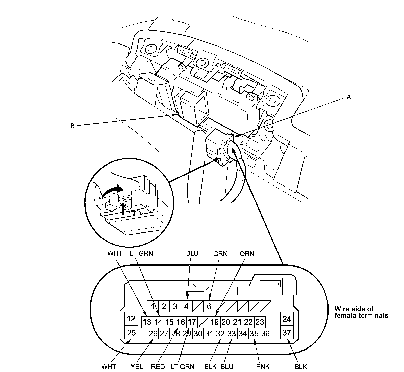 3. Disconnect the 37P connector (A) from the power window master switch (B).