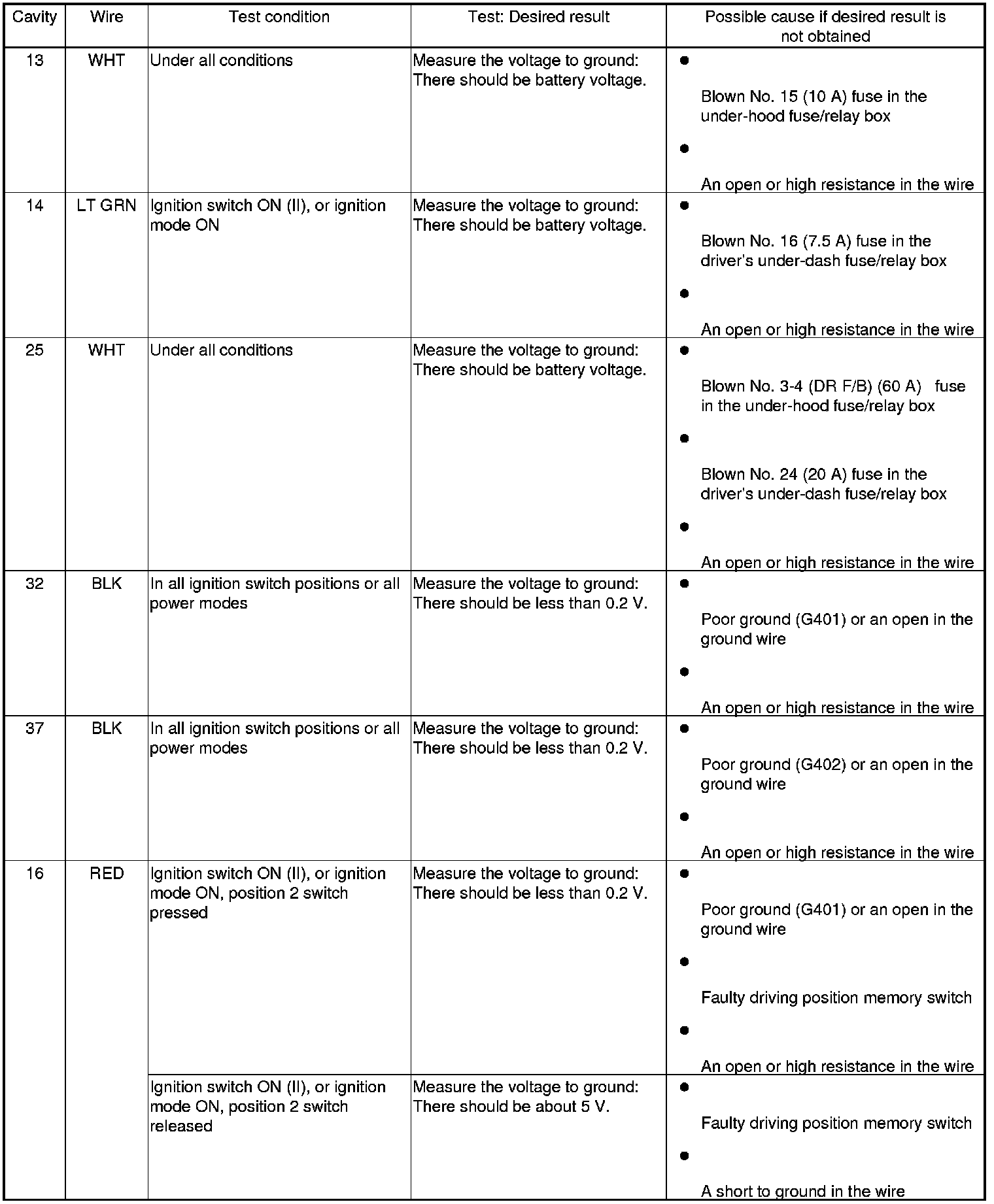 5. Reconnect the connector to the power window master switch, and do these input tests at the following connector.