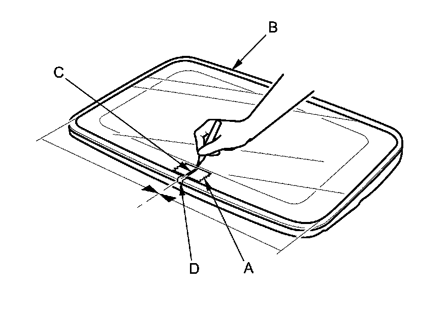 2. Place a piece of masking tape (A) on the middle of the front edge of the moonroof glass (B). Make sure that the tape is on the glass only, and is not touching the weatherstrip.