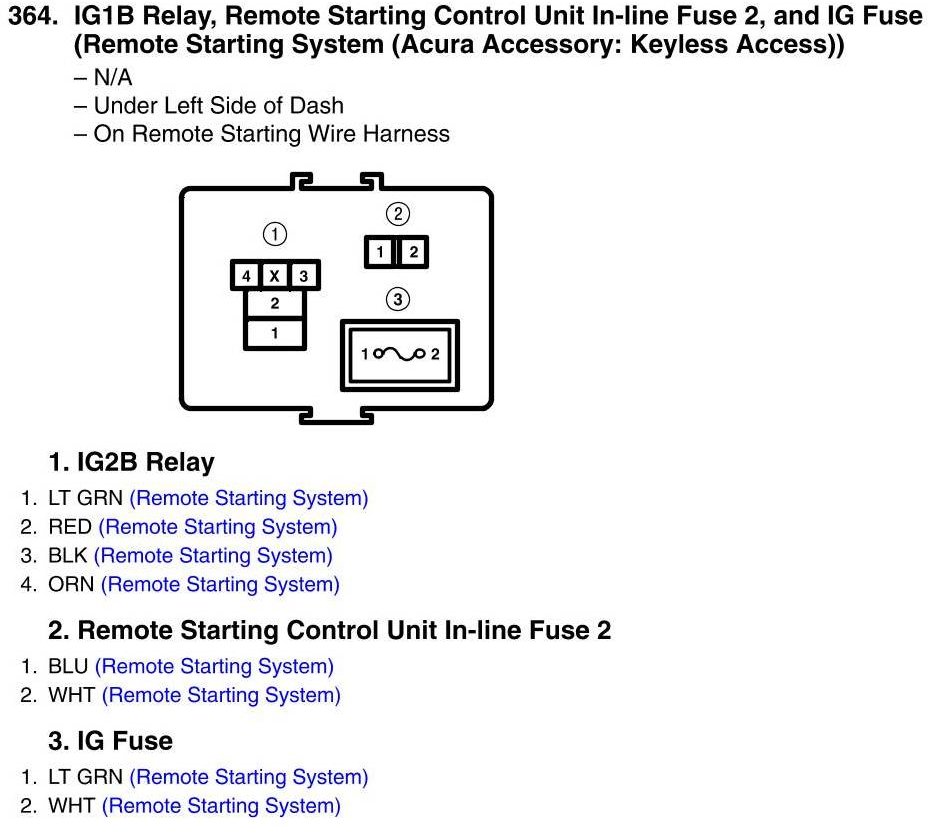 View 364 - IG1B Relay, Remote Starting Control Unit In-line Fuse 2 and IG Fuse Connector View (Remote Starting System (Acura Accessory: Keyless Access))