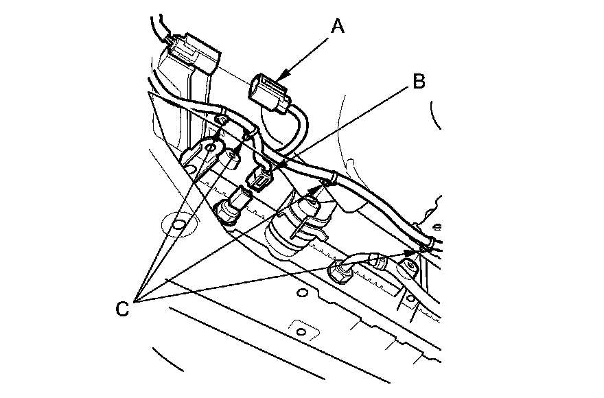 7. Disconnect the radiator fan motor connector (A) and the engine coolant temperature (ECT) sensor 2 connector (B), then remove the harness clamps (C).