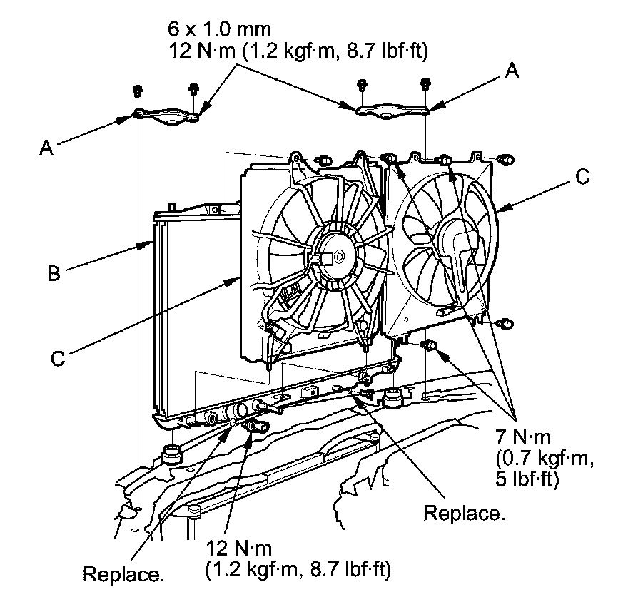 12. Remove the upper brackets (A), then pull up the radiator (B) with fan shrouds (C).
