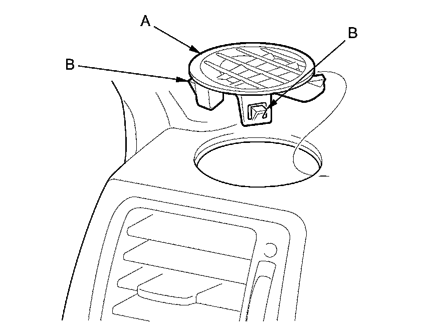 1. Insert the appropriate trim tool into a gap between the side defogger vent trim (A) and the dashboard, and pry on the hooks (B), then remove the vent trim.